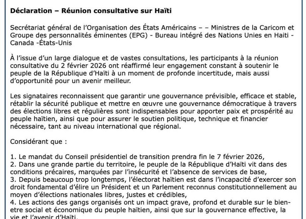 Déclaration conjointe du Secrétariat général de l’Organisation des États Américains, des Ministres de la Caricom et Groupe des personnalités éminentes (EPG) et du Bureau intégré des Nations Unies en Haiti – Canada -États-Unis.